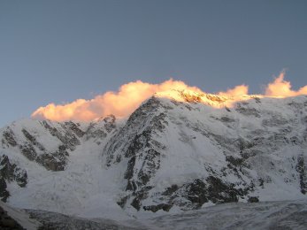 The 18 th of July. At three o'clock in the night we got up, put on the boots and started cooking. At 6.15 a .m. we set off from the bivouac. We pass three memorial tables (it was impossible to understand, whom they a dedicated from a distance). We climbed to the shoulder of Gestola, had a rest, took photos). Then we went on passing the route, HaSe started going as a leader. Snow became worse: sometimes it was firn, sometimes – crumbly snow. We went rounding a little bit as they recommended when the avalanche danger was present. At any suitable case I tried to look to the deion (I had several specimens of it). Rise. HaSe became exhausted, I became the leader. We passed “rocky islands”, had a rest. Changing each other, resting and trying to be quicker, we went below hanging cornice and from the left right we came to the top of Gestola. The time was 12 o'clock p.m.