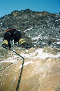 One more sitting night-pass and we came to the homestretch. That day I climbed as a leader. I tried to rise and went a little bit to the right from the top. It was impossible to come to the edge to the left from the top, and the coming was dangerous because of overhanging ice cornices. The same situation was if climbing straight forward. To the right from the top there was an unnoticeable break in the line of cornices, and I went in the direction of it.