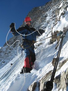 Moving became more difficult, altitude got closer to the point 4800. There was ice, sometimes pure, sometimes covered with snow, sometimes changed with rocks. Ice was very solid and if it was not covered with snow it was a real problem to twist even good Grivell ice screw. Crampons and choppers got into the ice with difficulties. But at the end we reached the last ice wall, the last snow edge and that was all, I came to the apical edge. After short rest I received my colleagues. We hammered in the slope snow anchor, left our rucksacks on it and, following the steps of three-day preion of our friends from Samara and Sankt-Petersburg, having ascended to Gestola along the edge via the summit 4310, climbed to the top.
