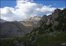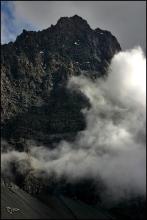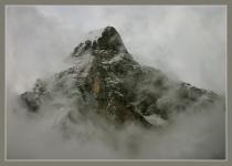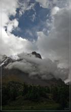 Вершина Чапдары в облаках. Вид из ущелья реки Бодхона