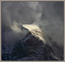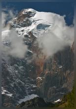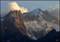 Подсвеченная вечерним солнцем вершина Бодхоны в облаках. Вид из ущелья реки Бодхона.