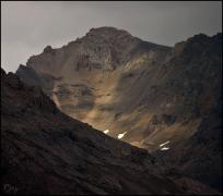 Освещенная вечерним солнцем вершина горы крупным планом, выглядывающая из-за одного из отроов Зеравшанского хребта. ЕЕ можно увидеть на предыдущем фото, как небольшой темный бугорок над отрогом