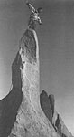 Для не избалаванного тренеровками организма даже после Кафедрального пика было не комфортно подняться с уровня моря за день до 3600. Да и вместо коньячка вечером было красное вино, что не слишком способствует, как оказалось, акклиматизации. 18 августа 2001 Просыпаемся. Голова у некоторых участников мероприятия тяжелая, мысли медленные и, в основном, о смысле жизни. Два часа траверсируем сыпухи, подходя под маршрут. Троп нет вообще. На фото маршрут по центру, уходит на право в центре стены и дальше идет за перегибом. После сыпухи не связываясь, молотим метров 70 бараньих лбов, оценивая, что нужно было бы бросить веревку только наверху. Далее чередуются крутые кулуары и небольшие скальные стеночки. Полно живых камней. Когда выползли на гребень, разделяющий North Paliside и Starlight, увидели на другой стороне большущий ледник с бергом под стеной. Гребень был развален еще больше, чем то, по чему мы лезли до этого. Последняя 50 метровая стенка, и мы на вершине, на которой может поместиться только 2 человека одновременно. Рядом торчит 10 метровый палец, который выше вершины на пол метра - метр, но на него нужно лезть по одному, вешать веревку, а времени у нас - только записку написать. Хотя он то и притягивает местных любителей. Перопроходец Norman Clyde писал об этом восхождении в 30х годах. Это было соло и времени на спуск у него было в обрез. Он пробовал несколько раз накинуть на "палец" лассо, но это не получилось. Тогда он опоясал его веревкой и залез, используя принцип страховки, каким пользуются электрики и связисты. Сидя или стоя на этом "камне", многие испытывают эйфорию и ощущение полета. В 50х какой то нехороший человек вогнал шлямбур в макушку, испортив такое место. Но уже четвертый час, и мы рискуем не спустится засветло. Неспеша рвем вниз. Спускаемся по пути подъема - 5 дюльферов, между которыми сползание по разваленым кулуарам. Вода закончилась, очень кстати попался небольшой, падающий со стены ручеек. Когда сматывали веревки на сыпухе, солнце ласкало верхушки скал последними лучами. До лагеря идем уже в темноте.