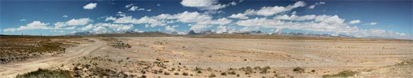 Последний поворот ущелья – на восток – и перед нами открывается вид на перевал Таш-Рабат (3964 м). До середины перевального взлета еще удается сочетать преноску рюкзака и "перекатку" велосипеда, но затем высота и усталость берут верх над нашими силами. Да и тропа не настолько хороша, чтобы катить байк не напрягаясь , поэтому приходиться "челночить". К двенадцати часам я уже разгребаю тур на перевале в поисках записки и ставлю фотокамеру на штатив. Далеко внизу виднеется долина реки Кок-Айгыр, поблескивающей в лучах солнца. Здесь же идет снег и холодный колючий ветер режет лицо. Начинаем спускаться. Через три километра, потеряв около двухсот метров по высоте, мы с удовольствием отмечаем, что долина становится пригодной для передвижения "верхом" и, с этого момента, начинается уже по-настоящему велосипедный этап нашего маршрута. Выраженной тропы не видно, но отсутствие суриных нор и крупных камней позволяет держать скорость до 15 км/ч. Десять минут спуска и, из-за отрога, испугавшись нас, движется большое стадо огромных лохматых животных. Это яки – их пригоняют сюда из Ат-Баши на летние пастбища. Появившийся вслед за яками парень-чабан, удивлен, увидев двух велосипедистов, знаками и по киргизски поясняя, что "таких" видит тут впервые. Мы выезжаем из отрогов Ат-Баши и попадаем на типичные сырты – растрескавшаяся глинистая почва с редкими пучками травы. Езда по прямой практически невозможна и это сильно снижает скорость – до 8-9 км/ч. Однако, оказывается достаточно удобным ехать по высхшему руслу. Реки, стекающие с южных склонов хребта, попадая в долину, уходят под грунт, но следы весене-летних паводков выражены очень сильно. И русло того небольшого ручья, что стекает с перевала Таш-Рабат, достигает в устье сотни метров в ширину, при этом дно настолько плоское, что можно устраивать настоящие гонки. Так, проехав пять километров, мы с Денисом подобрались к берегу озера. В пятидесяти метрах от берега пришлось оставить велосипеды – берега заболочены и колеса стали попросту вязнуть в глине – прыгая по клочкам травы, подбираемся к самому берегу, спугнув целую стаю диких гусей. Черный индийский гусь гнездится на берегах Чатыр-Коля, тысячи этих птиц буквально оккупировали озеро, находящееся на высоте более 3500 м. В меньших количествах здесь встречаются различные утки и другие птицы. У берега нас догнали два швейцарца на