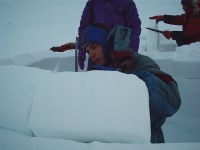 А потом была пурга. Настоящая. Та, что не дает поднятся, и можно лишь ползти, цепляясь за камни и снежные заструги. Она везде и всюду. Она колет лицо летящим ледяным вихрем. Она пугает своей силой. Мы резали снежные кирпичи на ощупь, ползком затаскивая их на склон. Это продолжалось невозможно долго. И когда, наконец, мы втроем оказались внутри нашего снежного убежища, то сначала не поверили в то, что можно просто что-то видеть и никуда не падать. "Как бы мне ненадолго выйти?" - спустя полдня, этим вопросом поневоле начинаешь мучиться. Всего лишь за 30см снежной стенки иглу бушует стихия. Пока собираешься с духом и начинаешь сначала медленно, потом все быстрее одеваться, Дима рассказывает историю из книжки Бермана про то, как все это было у них. Мы смеемся и предвкушаем новые ощущения. - Ледоруб возьми, а то возвращаться замучаешься, - командует начальник, и хитро улыбаясь, говорит, что совсем не шутит. Пара таких выходов (а точнее выползаний) в день - и впечатлений и приколов на эту тему хватает на порядочную часть времени сидения-лежания в иглу. А потом начинаются бесчисленные философские беседы, начинающиеся как всегда туризмом и заканчивающиеся как всегда женщинами! Впрочем, есть и еще одно развлечение - еда. В этой тесной иглу, буквально врытой в склон нам