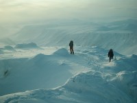 на ходовой день до обеда. Ночь - самое теплое время, после жарких ходовых часов с рюкзаком. В двух спальниках, вставленных один в другой - тепло, особенно, если спишь в серединке. Это пожалуй, одна их немногих слабинок для меня, как для женщины. Вторая - лыжню топтать не надо, мужики и так, как бульдозеры, только поспевай. Под утро температура в иглу минусовая, но когда начинаем готовить завтрак, заметно теплеет, уже +1 по Цельсию! Это в первые несколько дней - никаких проблем проснуться, отбросить еще сухой спальник и бодрыми движениями начать сборы в окружающее тебя белое безмолвие. И если только на "улице" не пурга, то утрений моцион можно считать вполне безопасным. На пятый-шестой день, найдя стоящий у входа анорак и выбив оттуда лед, с внутренним содроганием и внешним оптимизмом со скрипом протискиваешься в узкую "мышиную" щель, называемую "выход".