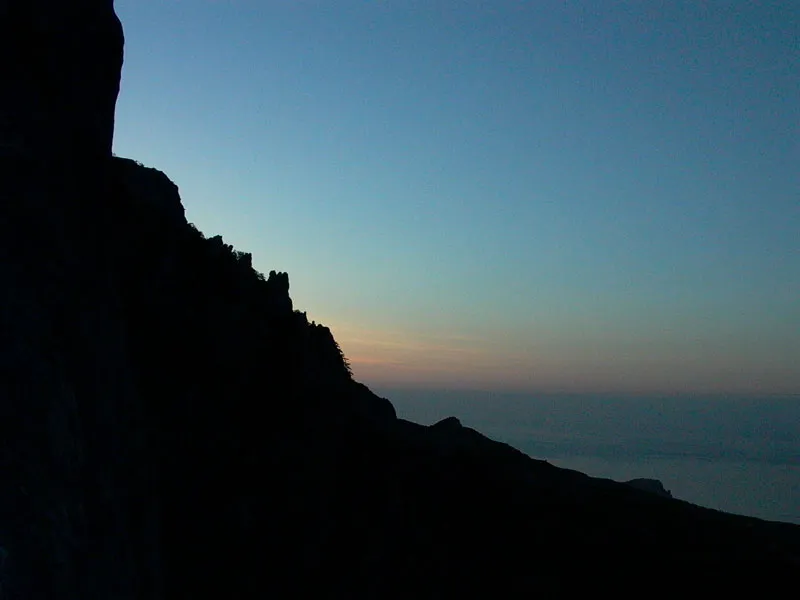 Проснулись около пяти утра, пока собирали шмотки и перекусывали, обменялись впечатлениями от ночевки. Выяснилось, что каждый устроился, как мог. Мне, как старому аксакалу, досталась горизонтальная полочка сантиметров 60, на которой я лежал, подвесив ноги петлей к перильной веревке и подпирая голову рукой или краем отщепа, в общем нормально. Самое главное – было тепло.