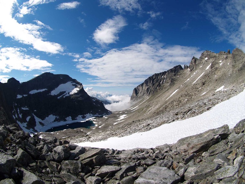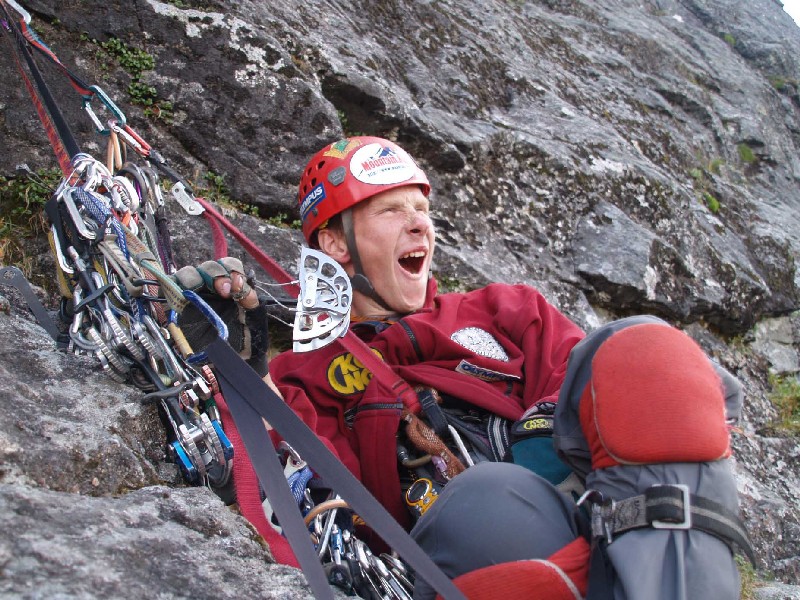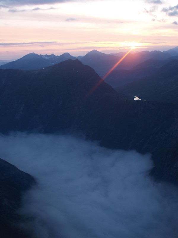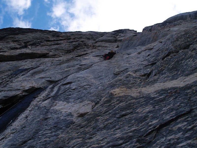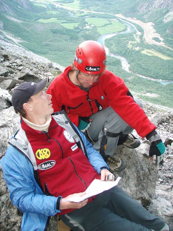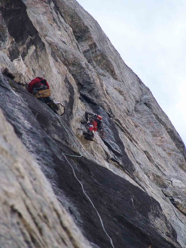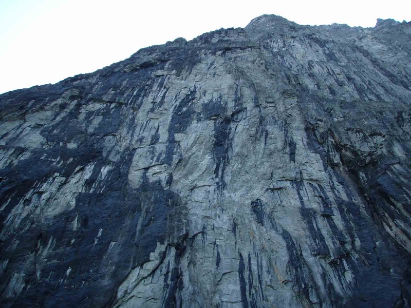 Only one thing made us feeling pleasure: the weather was fine. But, on the other side, if it were raining, we could get much water. Once in the evening we made a party, everything was how it should be: music, cognac, choral singing and even salute from gas ballons. It became more merry, but only for a short time.Two of the days we were watching British soloist Michle, who was going to climb up the swedish route. He several times tried to come to the beginning of the route but every time run down from falling stones. We hoped very much that he would give up his idea, but one morning saw his steamer trunk at the several ropes above the earth height, exactly in the couloir where stones were falling continiously all the time. That day in the evening a helicopter flew there and salvation works began. It is necessary to pay tribute to norwegians. They operated very clear, it seemed that in Russia we couldn’t do it like them. The helicopter made two circles taking photos, and on the 3rd circle they hang a man on the cable who hooked the lifeless body. We stopped all our activities and with the hearts sanked looked after the operation. The helicopter was hunging in the couloir, where every moment it could be broken by falling stones, textually 10 minutes later a gigant plate fell there . When the helicopter was passing us we could distinctly saw Michle’s body, hitched directly to the system, they hadn’t even pulled it in. What could we think? – Surely, a corse. Our misgivings comfirmed when the helicopter instead of going to a hospital landed in the valley. We tried not to speak about it. That evening everyone of us especially wanted downwards and home. And again came new day, again carrying steamer trunks. Dan was working as the number one. By the walkie-talkie all the time they asked for the rope, they so something like a positive piece! By the midday we climbed to grassy shelfs, forward was seen nothing, banisters were going in mist, sometimes small stones were flying down from there, but all this didn’t metion, there was green grass underour foots, bees were flying we could stay not in stirrups, but on plane – what a pretty feelling! But pleased we were for a short time. As soon as it became positive slooping it became unreal to carry steamer trunks alone. The only variant was like this: two of us on the palispaste and one – attendant, and this way - 3 moves per rope. It was wished something to get unfastened and fall down. Moreover, the mist dispersed and a new wall, approximately like 1,5 Morcheky stood up in front of us, and something said that we didn’t see it up to the end… Eh, we were here for a very short time again. On the one shelf we found some snow, so we drank tea as much as we want and renewed our ballast for about 50 litres. How we didn’t want to leave that place! Water – here it was, food – here, a nice sleeping place – there, on the grass. What we needed more! But Dan commanded to go away and went up himself, we gathered things. After 50 metres we saw one more shelf and a theatre stage, Saveliev was going there back and forward almost without belay and mumbling. We could hear only scraps of frases like: “It could be climbed up here… and here too… No, it’s illogical… No, here they couldn’t go exactly…” “ - Is it the end? Grisha, write to Pionova, let her give us Odincov’s phone number, may be he can prompt us where they climbed here.” The pendulum we, however, didn’t find, but noticed some triangular cornice, that was likely to be marked in the description, when we reached it, it became clear that we were going the norwegian route. The rock was friedle, climbing – difficult, bags were clinging to all salients, generally… everything was excellent… In the evening we again declared communism for food and poured out 50 litres of water that were carried there with such difficulty. When, according to our reckonings, we were in few days away from the top, Dan and David broke their platform. On approaching to the next spending the night we accidently woke up the Trolls. Thuder and lightnings! It hit at the neighbouring tops of our mount. It appeared that Rangarek (Armageddon in local idiom) had come. A suggestion to miscarry all the iron far away was voiced. A good idea, but somewhere downwards there was Daveid, the last words we heared from him by the waklie-talkie were: “Switch off walkie-talkies, quickly…, or now...”, and that was all, the end of the connection. We tried to carry steamer trunk by palispaste, but the rope didn’t go, the bags were likely to be sticked. What could we do? May be Dave hadn’t unfastened them from the station, let’s give him the rope. So, we give him firstly small piece by small piece and then several metres in a moment. Then through the noise of the rain we heard a hair-raising wail. Then rope was twitched several times. We decided to pull. 30 minutes later the bags and a man with the twisted face appeared. The first thought: let’s run away, this fellow wasn’t in a good mood, but we had nothing to do. The first 5 minutes after the meeting we could understand nothing but swearing. Then it was cleared up that we were a little bit guilty. It happened this way: Dave was sitting at the station when the thumderstorm began. The steamer trunks were not raised for a long time, so he decided to carry a part of them by banisters and then went down to take the second part. He had already climbed about a half of the rope when saw that we started to pull steamer trunks and stretched the station. He went down like a bullet and began to try to unfastened the station, and suddenly… Pour Dave, he catched himself 100 kg of bags. That was why he was a little bit angry. But it was normal… The thumberstorm had sharply stopped and we began to settle down on the shelf, as there was nothing and nowhere to hang. In the next day morning Dan heroically decided to reach the top by all means. We ate nearly al