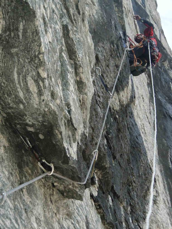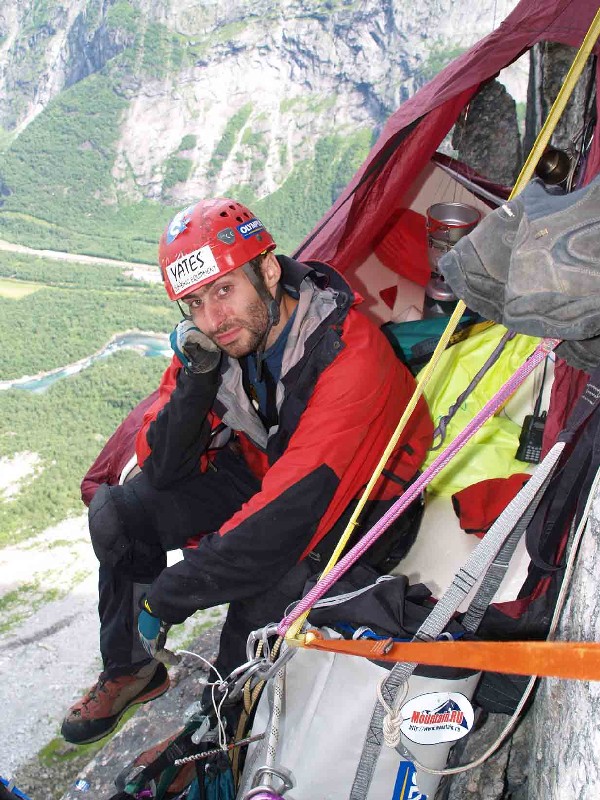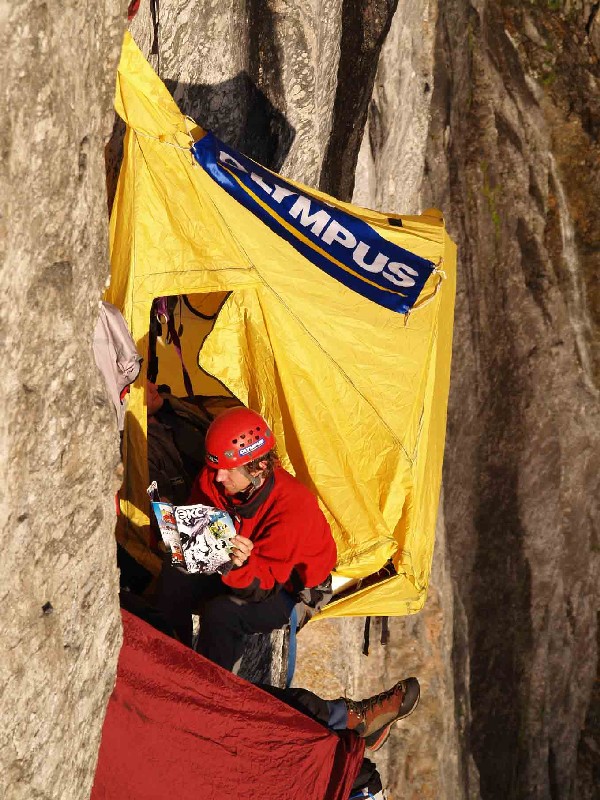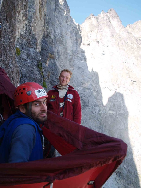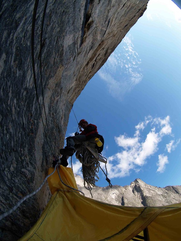 Night passed strangely calmly, didn’t know how other, but as for me, I felt asleep immediately and woke up only closer to the morning. Represent, you open your eyes, above is yellow tent, all is like you are lieing in the tent somewhere in the camp or even in the forest near Moscow, and suddenly you hear strange sound like muted airplane drone. I automaticaly opened the tent to understand what was happening and suddenly felt giddy: we were hunging at about 200 metres above the earth! Near were flying basers. Everything became clear. O, shit! We had yesterday climbed to the wall! And now would’t climb down for a long time… this thought made me feel uncomfortable. In the morning the next surprise was waiting for us, the withdrawable bolt, on which one of the platforms + 3 bodies + 4 steamer trunks + big heap of different things were hanging, was taken out from the wall by the light handmoving. This news put all of us to a kind of shock, we made revision and recognised that there were only few fine bolts, other had too cut tsangs, and they didn’t open inside of the wall. Generally speaking, it was a trouble and even Saveliev, the supporter of pure style, lamented that for the kilometre-long wall five bolts were not enough. Apropos, it was he, who had spoiled our bolts with the help of the saw, could he do it deliberately? It was normal…
