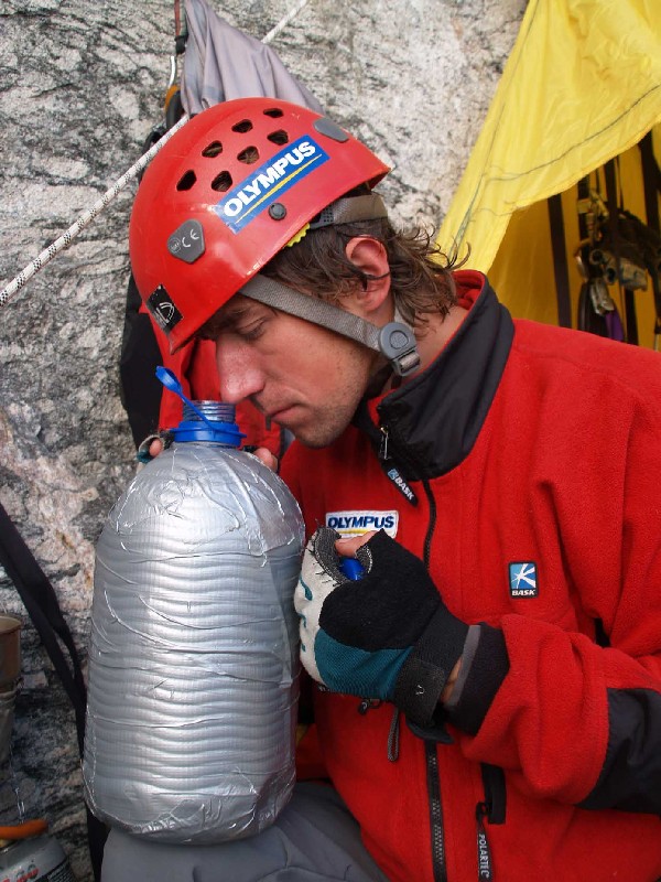 The life became better from day to day. Every day we tried to lay down earlier in order to get up and start the work earlier the next day, but we didn’t manage to do it, so everyone had a greate lack of sleep. People began to nap at the stations and especially while belaying. On the second day it was recognised that we had drunk water of two days forward, tried to spare, but insuccessfully, we wanted to drink very much. We tried to made “waterdripper” (two hooks and a hermobag) and even managed to gather 3 litres, and on the joy immediately drank it out. Next time 1,5 litres from 5 gathered flew down with the bottle, that, apropos, were necessary to guard, too. The work was running, every day a pair of us was going forward, upwards. Because of the hangings people could hardly be seen, sometimes only stones and pieces of moss flew down. The work was running with the variable success. The temp of moving was really aggrieving: sometimes we managed to hang 1,5 ropes a day and a half of rope was not along the route. So that way day by day we climbed. Above the head was the next hanging after which seemed to be positive piece of wall, on the right – a couloir, where every half an hour large stones, as big as Grisha’s bus, rolled down with terrible noise, and downwards there was the valley, native camping and observation platform where idlers’ strong optics was shining. Every morning from about 8 o’clock a.m. on the observation platform a column of telescopes and photocameras began to form up. They were taking photos of us mostly and sometimes of falling stones. When we came back to camping they said that we could be seen excellently, even fingers on the hands could be distinguished, they followed every our step all ten days long… Pervents… Generally on the 3rd or 4th day our mood began to go down, the most spoilling thing was the complete unclearness where we were, how much and where we should go futher.