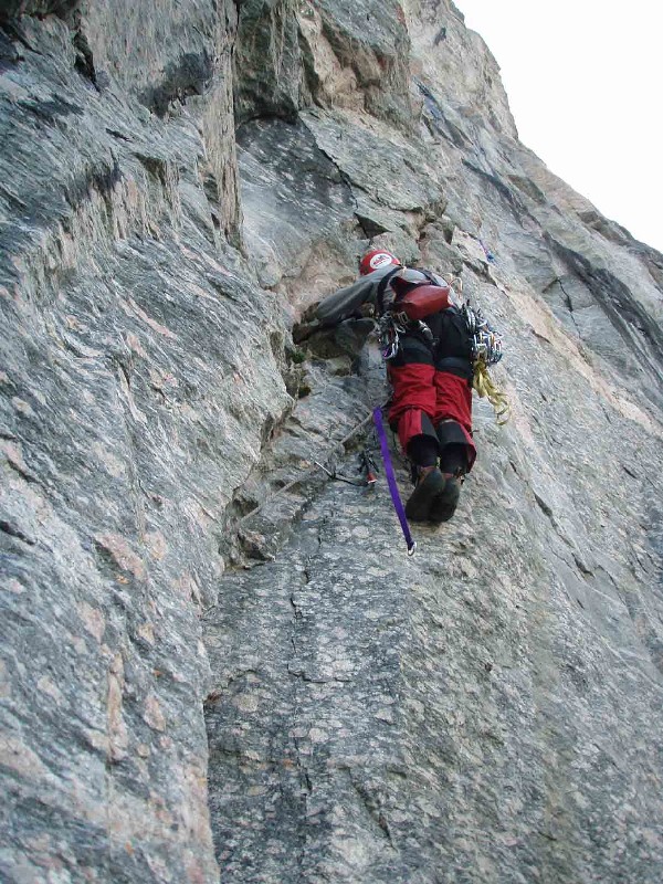 The whole day was spent on solving organisation questions. In the evening we came to agreement that we should go to the wall early in the morning in order to avoid rain that started there stricktly at 4 o’clock p.m.. However, closer to the end of the night it was realized that only the half of the group had put the clocks to the Norwegian time. Alarm-clocks were ringing from 6 till 8 o’clock a.m.. As a result nobody sleeped himself out and the departure was postponed to 11 a.m.. Thus, we prepared things to delive and started the way: 3 km by freeway up to the railway brigde.Across the bridge – by short defections, because trains there were rasing at the speed of about 140 km/hour. Then 1,5 hours by coast and moose paths up to the big stonesteam near the foot of the wall. Then 3 more hours upwards. As soon as we started to pass the disposite of large stones, different finds that couldn’t but perturb an alpinist’s heart: scarps of broken ropes and loops. But some useful things, for example a pair of carabines of well-known american firm, were also found there. While we were creeping over the stones, it started raining, so when we reached the wall, we had already been considerably drenched. Then we had to find a route. Firstly it had been desided to climb the route “Baltica”, but where the beginning of it was, we wonder… The description was rather skimpy, we had only the UIAA scheme. Cornices, slots – there were a lot of such things. So, we began to stroll along the wall in hope to find marks that could mean the beginning of the route. Suddenly Grisha shouted joyfully: “I found!” – and waved something like a wrapper. Appeared that it was the packing of vitamins made in Russia in 97. Oh, here were russians! We looked attentively – truthly, the slot, something like a loop hung. Probably, there. So, we rejoiced and run back home. On the way we came across someone’s fresh traces. David declaimbed that they belonged to a wild boar and we should be more careful, but nobody took care about his words. Later we realised that a wild boar turned out to be a little baby-deer, that David himself nearly trampled down. As we came to camping we felt something wrong. Different people came to us and asked various questions. Later we understood that the master of camping had told everybody that we were going to climb the wall. So, whole families came to stare at us, and it was Dave, who became the most popular person, he showed our platform and explained everybody in details how to live in it. In the evening one Finnish alpinist visited us and said, that we are fine fellows, “Cool idea!”. Dave Saveliev showed him the newest invention, ancor hooks, and tried to sell a pair of them, but the finn said that “aid climbing” didn’t taxi, and moreover, he had to climb 10 ropes 7a on the route the next day, and went away.The last trait to our popularity added an episode at the kitchen. Two swedes gave up us the stove, saying that we need to eat a lot. They even wanted to give us a pan, but then, when they found out that we were going to cook “pilaf with pork”, quickly reconsidered.