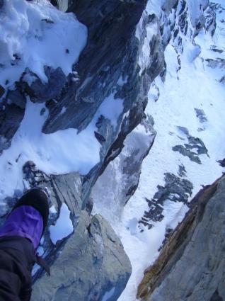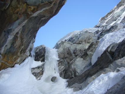 Pavle avoiding the frozen waterfall through 5-th category cliffs.