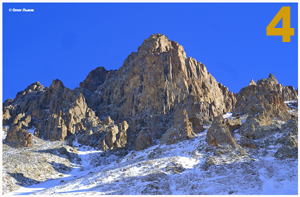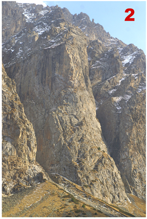 Trad climbing is a technique when only temporary protection equipment is used – for instance, chocks of different types. Such trad routes here could be fitted with stationery anchors every 20-25 meters for safety. From the left adjacent to the left bastion there are cliffs up to 100 meters high, they could be used for climbing of different level. The right buttress is of less interest for climbing, but it slides to the road and ends up as a 12-meter high and 50-meter long wall. Overhanging and not very blasted, this face is ideal for a dozen or more routes of 6-8 belayers long, with category from 6a+ to 8b. After commercial competitions a few years ago, there are some white restriction lines left on the wall. The dissolvent wouldn’t help, alas, only a sand blaster would do the job to clean them away. This would be an ideal place to practice prior to serious competitions, the height of 3000 meters above sea level would help the body to acclimatize and get fit. On the road to Manzikli, after the valley spreads out, on the left there are walls up to 200 meters high which rise to peak Abaja. This could be a good alternative to Uchitel-Pioner massif for those, who are too lazy to go to Alpengrad and further. Joshkar-Ola massif A picturesque and well climbable wall up to 250 meters high, that stand out like a rostrum of a ship. Some faces are overhanging. Climbers say there are a lot of cracks for chocks. No worse then the Tree Bastions, but the approach would definitely take more time. The foot of the wall is at 3300 m. The exit to the ridge is between peak Abaja and peak Amangeldi at approximately 3950 m.