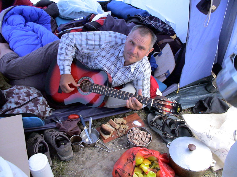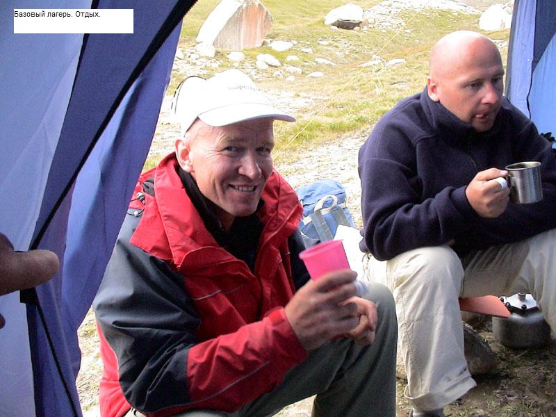 Sometimes the road disappeared, preserving only in the forest. The forest gradually became sparse, road turned somewhere to the left and we went on going along the river, by the path. Then we went up to the upper ruskie – the Kirghiz brought us there, and we had to pass a night there. There was the border of the forest. In the morning our Kirghiz with horses went away and we had to move our things from trunks to rucksacks and carry them on our backs. We had to descend to the river and then along the bank we went to the cased glacier and soon we reached the place of our camp in 2004. We didn't find provisions we had left. It meant that several next days (before cargos delivery) we had to b hungry. In a day we went up to the upper part of the first right-side pocket, where we found a spring. Before that moment we thought that there had been no weather. In the morning we went on climbing, then descended from the crest to the glacier to the rocky girth rail along which we rounded the icefall. One easy rope along the rocks (fixed rope) – and further along a pocket with large stones, and we were near the lake – the place where we left a reserve in 2002.