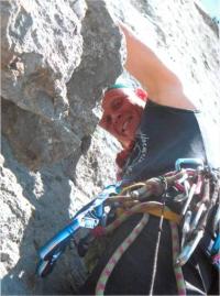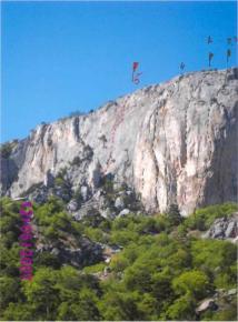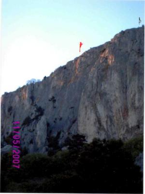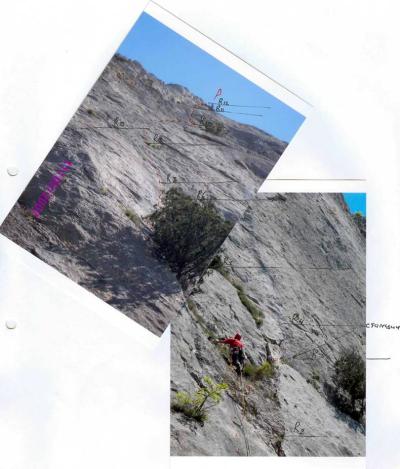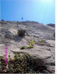 From the belay go upwards to the split 3 m (spits), then traverse to the left along the small ledge with juniper till the vertical corner. Go upwards 8-10 m by the corner (spits), to the small cornice, then go to the left to the wall, a good place for a horizontal climbing bolt. Then go 15-17 m upwards by the wall to the double spits. You can try free climbing (6 с -7 а ). The problem can be only with belay, screwing ears of spits. From the double spits go 10 m upwards to the distinctive crack 3 m, where 2 bolts are placed. From the upper bolt go to the right and upwards to the tree, 20 m climbing 6с -7а , till the ledge on the left from the tree, belay is on bolts. Then go upwards along the crack using bolts, nuts 20-25 m, till the belay on spits, climbing 6A-6B. From the belay go upwards through the split turning into a crack (bolts, nuts), and near a small tree go to the plateau 25-30m 5 с -6 а.
