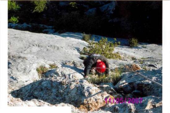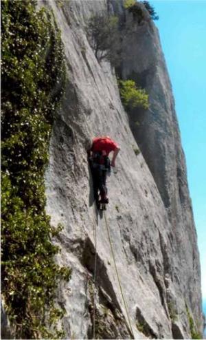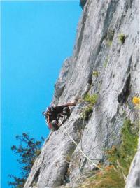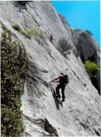 First pitch (30 m), 3 m ascent, climbing 5 C, then go to the right to the nail section and 15 m ascent with sky hooks to the small inclined slab, go upwards along it and to the right, to the tree and belay on bolts, blocked with chain. On the first pitch belay using spits and a climbing bolt a nut cable can be put through it.