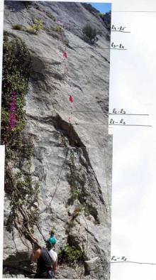 R2-R3 along the inclined ledge upwards and to the left to the tree, a bolt, 10 m, 5C, till the belay. R3-R4 upwards to the split 3-5m, 5 с -6 а , nuts, spits.