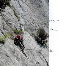 R4-R5 then traverse along the ledge to the left, 6-8m, till the corner, 5 с . Spits.