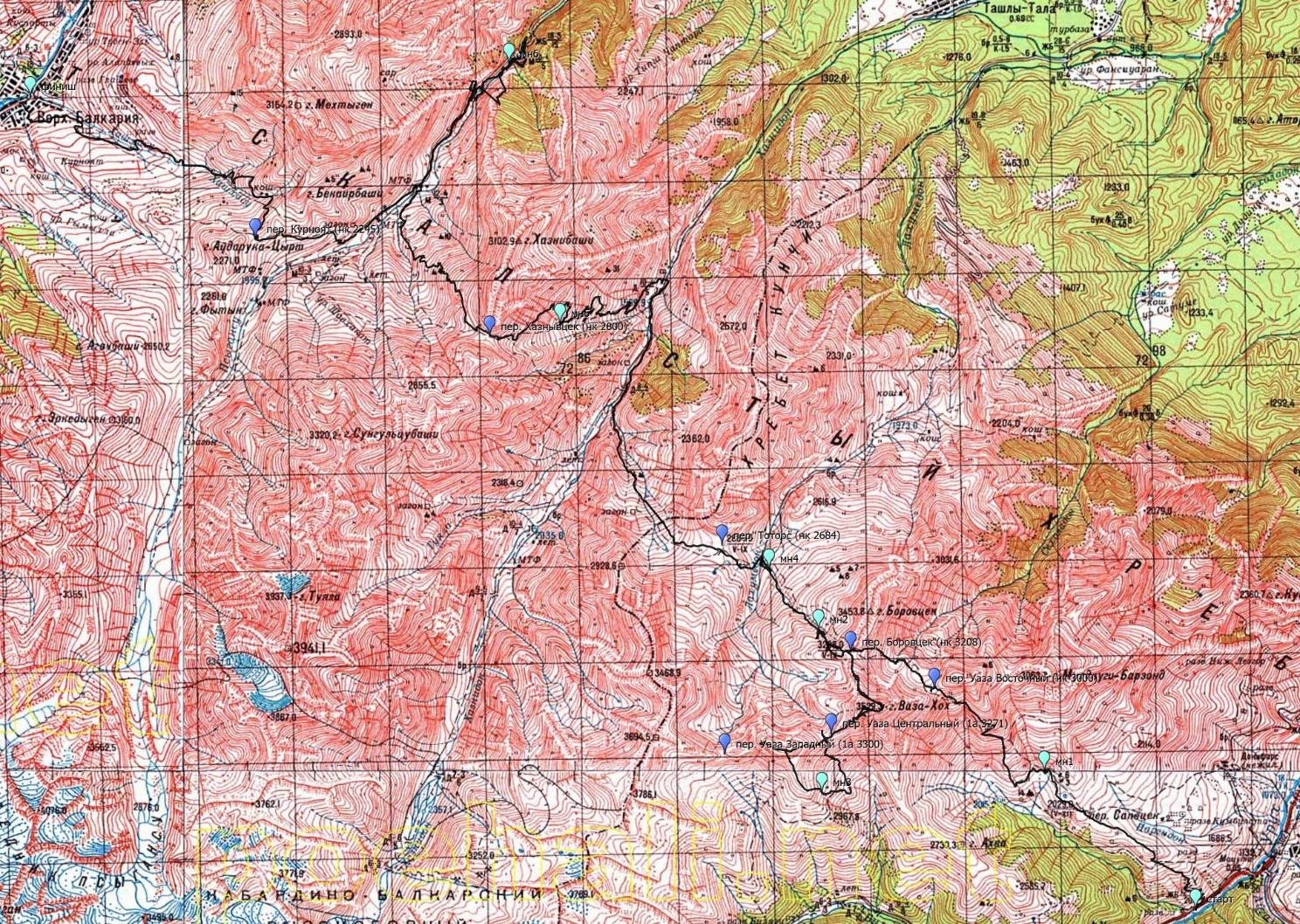 Нитка маршрута заявленнаяг. Нальчик - пос. Ахсау – пер. Уаза Вост. 1А 2963 – пер. Боровцек 1А 3120 – д.р. Лухамедон – пер. Уаза Центр. 1А 3271 м – д. р. Белягидон - пер. Уаза Зап. 1А 3296 м — д. р. Лухамедон - Пер. Тоторс 1А 2687 — д.р. Хазны-Дон — пер. Хазнывцек н/к 2521 — д.р. Псыгансу — плато Мехтыген 3154 м — Нижнее Голубое озеро - г. Нальчик Нитка маршрута пройдённаяг. Нальчик - пос. Ахсау – пер. Уаза Вост. 1А – пер. Боровцек 1А – пер. Уаза Центр 1А – д. р. Белягидон - пер. Уаза Центр 1А — д. р. Лухамедон - пер. Тоторс 1А — д.р. Хазны-Дон — пер. Хазнывцек н/к — д.р. Псыгансу — пер. Курноят н/к – пос. В. Балкария - г. Нальчик