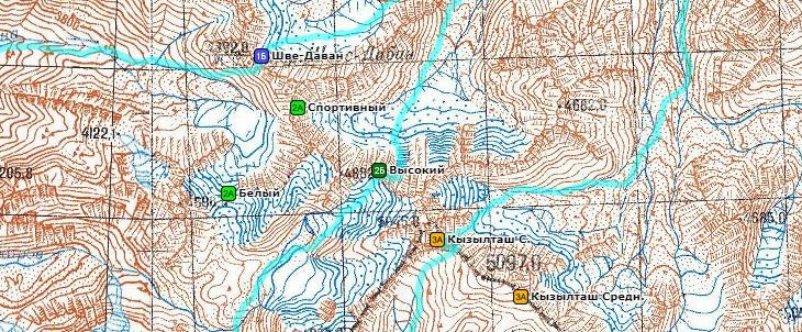 Специальное снаряжение (на группу 5 чел.): Каска, ледоруб, кошки, ИСС, карабины, жумар - все это на каждого участника, две веревки, ледобуры. Возможные места ночлегов: С северо-востока:. На морене. С юго-запада:. На моренах.