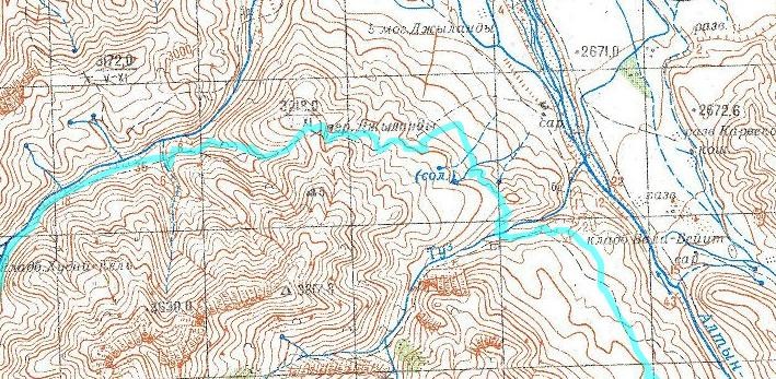 На следующее утро поднялись в 5 утра. Хорошо позавтракали молочными продуктами, которые местные девчушки принесли, когда мы уже легли спать, и отправились дальше вниз по долине реки Тар-Аша. Небо было затянуто облаками. Тропа по прежнему шла по правому берегу. Вскоре мы дошли до поворота в сторону н/к перевала Джыланды на который ведет дорога (Фото 55). С дороги открывается вид на Алайскую долину и реки Тар-Аша. Тропа по долине реки Тар-Аша в Алайскую долину просматривается по левому склону (Фото 54). Сама река находится внизу в ущелье.