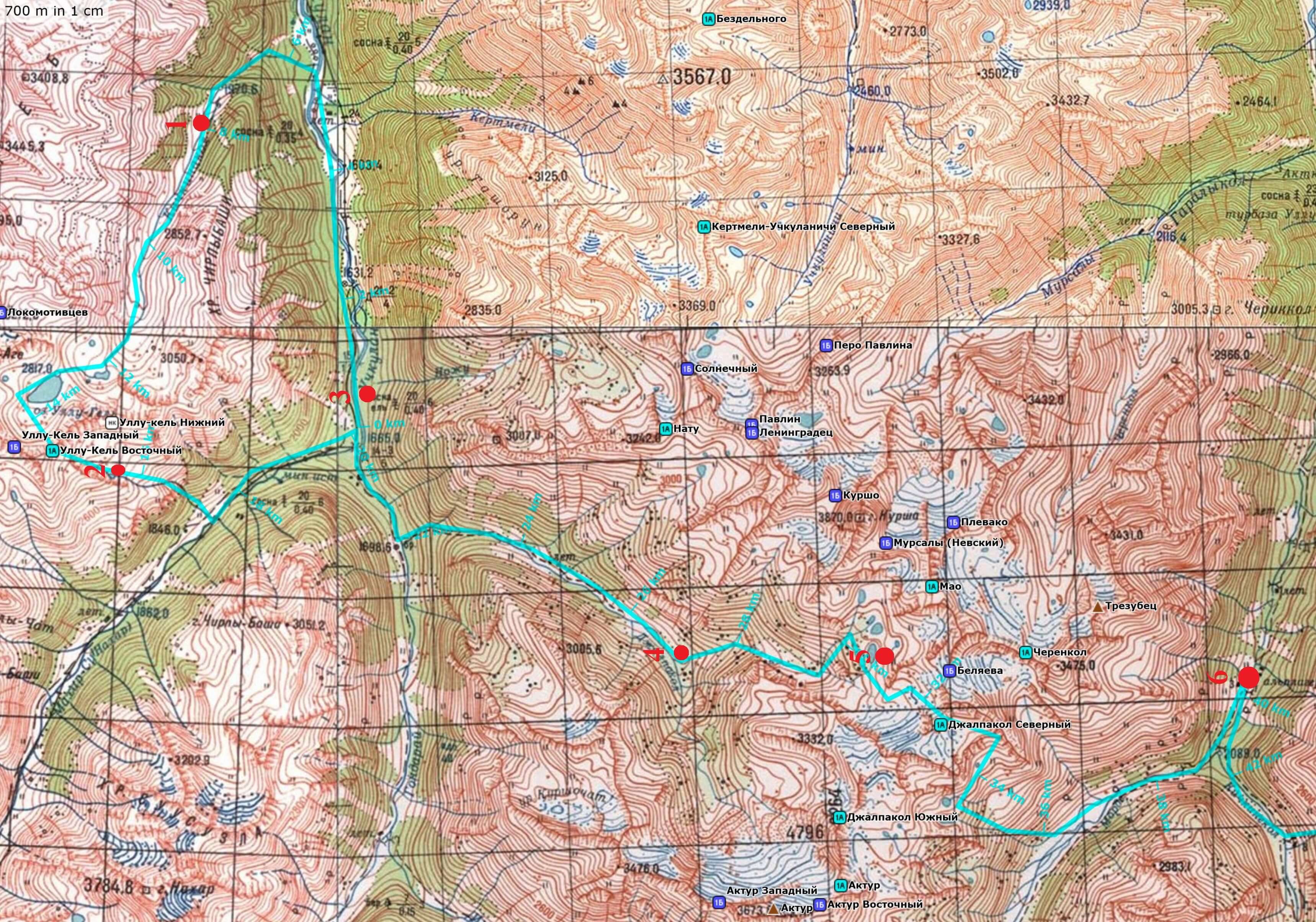 *С учетом коэффициента 1.2, без учета повторно пройденного пути. Подробная нитка маршрута. Заявленная: Москва – Минеральные Воды – д.р. Кичкинекол – оз. Уллукель – пер. Уллукель Вост (1А, 3050м) – д.р. Трехозерная – д.р. Нахар – т/б Глобус – д.р. Гондарай – д.р. Джалпакол – пер. Джалпокол Сев (1А, 3400 м)– Мырдинские озера – д.р. Мырды – а/л Узункол – пер. Доломиты Юж (1А, 3350 м) – д.р. Чиринкол – д.р. Кубань – д. р. Уллукам – пер. Хотютау (1Б, 3550 м) – л. Б. Азау – ст. Старый Кругозор – поляна Азау – п. Терскол – Минеральные Воды – Москва. Маршрут пройден без изменений, за исключением: пер. Улукель Вост. пройден радиально по запасному варианту через пер. пер. Уллукель Ниж (н/к 2900 м.). Все участники группы маршрут прошли полностью. Схема маршрута: Прилагается общая схема маршрута: Определяющие препятствия маршрута.