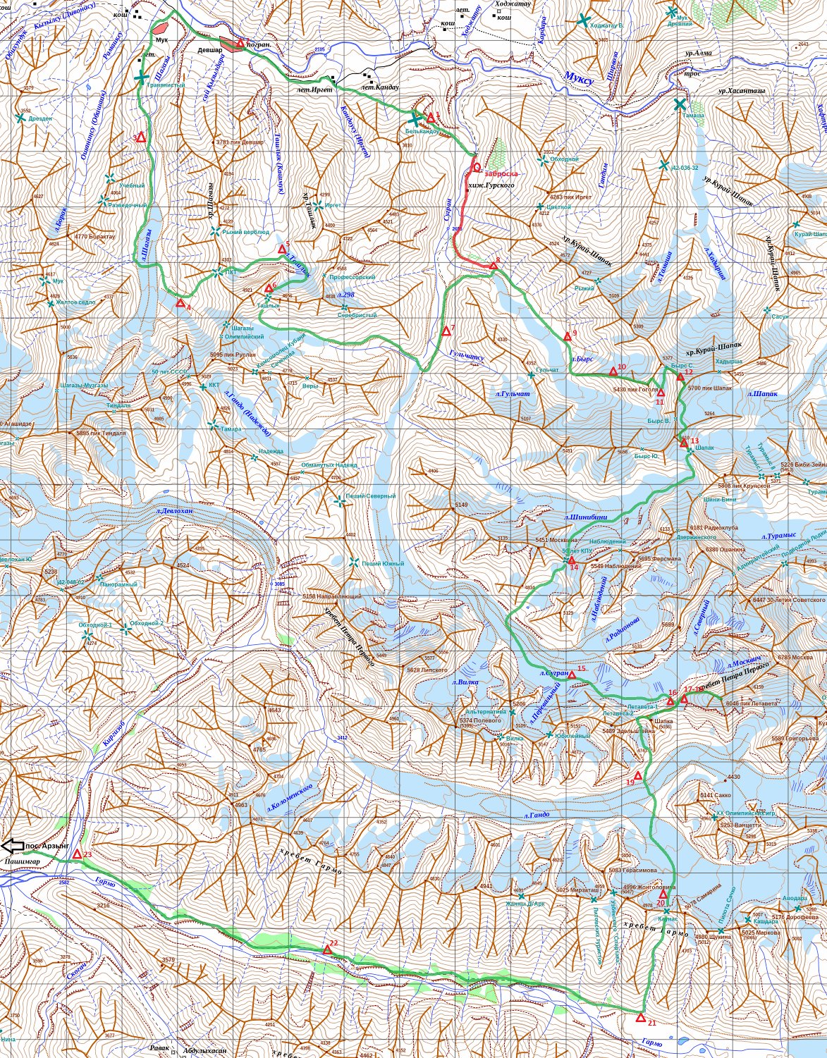 Организация туристского спортивного похода Общая идея похода Идея похода была в том, чтобы сходить красивый технический и высотный маршрут в новом для всех участников группы районе. В плане высоты очень хотелось сходить на вершину высотой выше 6000м, чтобы поднять свой высотный опыт. В плане техники интересны были разноплановые перевалы (скальные и снежно-ледовые) с протяженной перильной работой. Ну и самое главное - это, конечно, отдохнуть от городской суеты, побыть наедине с природой в хорошей компании. Поскольку 5 участников из шести ранее были на Тянь-Шане, то выбор однозначно пал на Памир. Из всех районов Памира мы выбрали Северо-Западный, поскольку он отличается относительно легким заездом на старт маршрута и возможностью плавно акклиматизироваться, поскольку именно плавная правильная акклиматизация является залогом успешно пройденного похода на больших высотах. Также нам хотелось вблизи посмотреть на высшие точки Памира - пик Исмаила Сомони (7495м) и пик Корженевской (7105м). Варианты подъезда и отъезда. Обоснование выбора точек начала и конца похода Стартом маршрута была выбрана долина реки Муксу. Заезд сюда из Душанбе относительно простой и дает возможность начать поход довольно низко, на высоте 2200м. Здесь же есть перевал Белькандоу(н/к) высотой ок. 3400м, который дает возможность плавно акклиматизироваться и совместить это с заносом заброски в долину Сугран на высоту 2600м. Таким образом мы прошли пер.Белькандоу 2 раза, тем самым обеспечив себе хорошую акклиматизацию до высоты 3400. Следующим этапом была акклиматизация до высот 4600. С относительно легкими рюкзаками мы прошли 3 перевала - пер.Травянистый(н/к, 2750), пер.ПКТ(1Б, 4270) и пер.Ташлык(2Б, 4600м). На последнем немало поработали технически, так сказать размялись. После всего этого мы радиально сходили вниз по р.Сугран за заброской и начали основную часть маршрута. При выборе вершины, высотой выше 6000м оказалось, что все подобные вершины в этом районе очень сложные даже для походов 6к.с. Наш выбор пал на пик Летавета, на который поднимались всего 1 раз в 1990г. Это была группа из Симферополя. В случае удачного восхождения мы были бы 2й группой. Финиш похода изначально планировался в долине реки Ванч в Поймазаре, однако за несколько недель до похода власти Таджикистана закрыли район ГБАО для посещения и пришлось перестраивать маршрут с финишем в долине реки Обихингоу. Мы очень боялись, что выехать оттуда будет большой проблемой, однако по факту оказалось, что дорога есть и проблем особых с выездом из кишлака Арзынг не существует. Аварийные выходы с маршрута и его запасные варианты Заявленная нитка похода: Киш.Депшар(р.Муксу) - лет.Иргет - пер.Белькандоу(н/к,3388м) - р.Сугран(рад.) - пер.Белькандоу(н/к,3388м) - киш.Депшар - киш.Мук - пер.Травянистый(н/к,2750м) - р.Шагазы - пер.ПКТ(1Б,4270м) - лед.Ташлык - пер.Ташлык(2Б,4600м) - р.Вера - р.Сугран - р.Бырс - траверс[пик Гоголя(5422м) - лед.Бырс - пер.Бырс Сев. - пик Шапак(5701м) - пер.Шапак)](3А,5701м) - лед.Шини-бини - пер.Наблюдений(3А,5440м) - лед.Наблюдений лед.Сугран - пер.Летавета (3А,5000) - пик Летавета(3А, 6046м, рад.) - лед.Гандо - лед.Дорофева - пер.МКТ(3А, 5300м) - лед.Гармо - лед.Гармо - р.Токаист - пер.Панорамный(1Б, 4700м) - лед.Бурс - р.Сагдар - р.Бохуд - р.Обихингоу - киш.Арзынг. Запасные варианты: