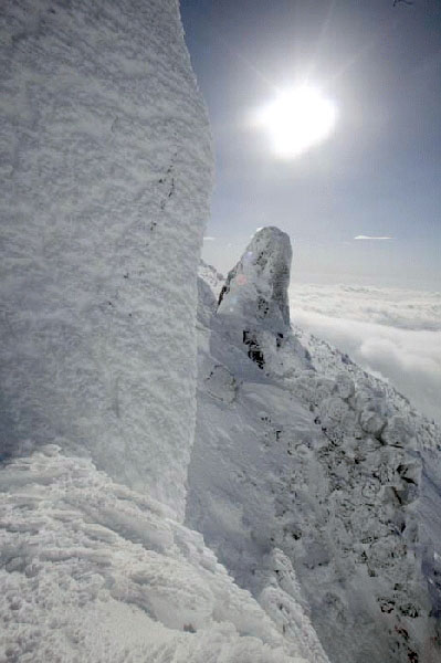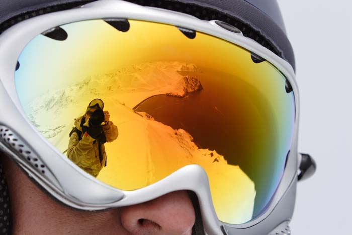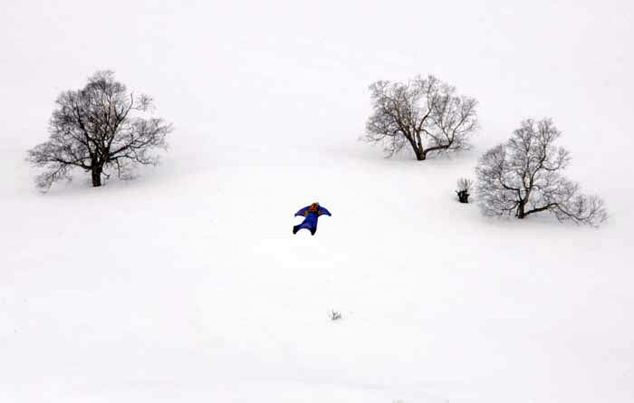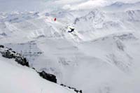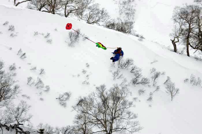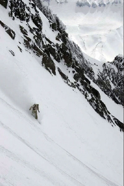 a snow-board rider descending on the same slope.