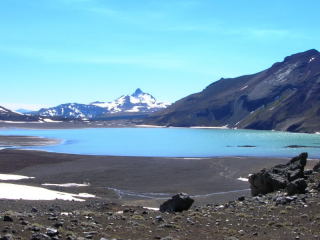 Впереди возник классический курящийся конус вулкана Вийяррика, 2850 м, утопающий в снегу с отметки1500м, с оттаявшей от гермесова адова тепла верхушкой. Напротив - второй вулкан, слегка пониже и без завершенности форм, не активный, без плеши на верхушке. Еле заметная тропа ведет по голым, усыпанным шлаком отрогам к перевалу. Обед на ручье. Снуют многочисленные ящерицы, не сильно переживающие по поводу близости снега. С перевала (некатегорийного, 1740м) вид на прекрасное озеро Лаго Азуль.