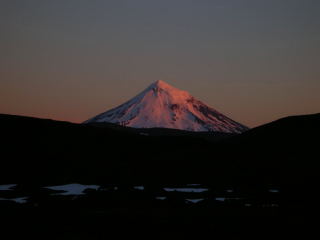 По сравнению с печальным опытом Камчатки, туземные лавовые поля пресекались еще легко и просто. Ночь на гребне с видом на алеющий при закате конус Ланина. Удалось даже наскрести веточки чахлого кустарника для костра, что далось легче, чем в сыром лесу. Спали на снегу, чтоб не повредить палатку острыми кусочками лавы.