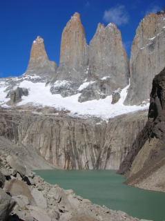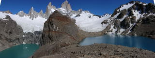 Утром резкий набор высоты по эрозированной от избытка туристов тропе, среди суховатого букового леса. С платообразного первальчика с озерками открылся сногшибательный вид на Фиц-Рой (3405м) и Серро Пойнсенот. Один из великих дней жизни, событие, сопоставимое с созерцанием Амадабланг, пиков Аксуу, Блока, 1000-летия Крещения, кратера Мутновского, кратера Эль-Алтарь в Эквадоре, да ледника Морено. Прошли рощу, набитую народом, с общественным сортиром. Здесь разрешено ставить палатки строго в отведенных местах, как и в Торрес дель Пайне. После моста долгий спуск вдоль реки. Вершин уже не видно. Обед, переход мощного притока по каменному завалу с видом на удивительно синий ледопад и кусочек Фиц-Роя. Поворот по бушвелду с видом на Каглиеро (2584м) с отвесной ледовой стеной, перелезание через колючую проволоку- границу парка, и далее- долго по прекрасному буковому лесу, полному гусениц, превращающих дуплистые стволы в труху. Ощущение Гевсиманского сада от этих кривых и дуплистых стволов. В конце леса, за палеомореной, у мощной реки, прячется от ветра частное владение предприимчивого аргентинца, который приватизировал весь участок поперек ущелья и лупит по 5 баксов с каждого проходящего туриста, вне зависимости, хочет ли он ночевать в его кемпинге. Решили, чтоб не платить зря, разбить палатку на удобной, защищенной от ветра, лужайке, с прочими удобствами , вроде перспективы заказа обеда (а продуктов у нас мало), сортира с бачком итп. Вокруг деревянного домика немало палаток. Пошли налегке выше, к озеру Электрико- мрачному, длинному, в скальной чаше, со сползающем в него в дальнем конце ледником. Ветер крепчает, дождь, скользкие скалы, конец тропы. «Озеро Варягов»- под настроение. Ария варяжского гостя. Земля титанов. Овальные, облизанные палеоледником скалы становятся слишком скользкими, возвращаемся. Дикие гуси у реки. Утром рано не все хотят на перевал Куадрадо с видом на обратную сторону Фиц-Р.оя. Набираю резко вдоль порожистого ручья. Вскоре выясняется, что рядом идет торная тропа. Налегке быстро, часа за 2,отпахал порядка 1250м набора. В конце было немного непросто, крутой снежник на ледничке, но трещин почти нет. На выполаживании - озерцо под льдом. Седловина узкая, каменистая под кубической скалой, отсюда и название. Радиалка 1Б, 1750м. Острые ржавые шпили напротив. Вид за перевалом очень впечатляет- рванные изломы ледников, острые иглы из бежевого гранита (основной материал самого Фиц-Роя, очень твердый). Видна вторая седловина , вполне проходимая с этой стороны, но пора возвращаться. Сам Фиц-Рой не так крут сзади, как спереди, но, все же -альпинистская 5-ка. С восточной же стороны - отвесная стена метров 500. На спуске целая толпа туристов идет навстречу. Один француз опасливо спросил, сколько еще переть и много ли снега.