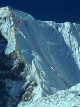 Yannick Graziani и Christian Trommsdorff. 8-13 июня. Южная стена, девственная вершина. Альпийский стиль, 2700м, М5, А1, 5+. По словам первопроходцев, маршрут сравним с известным Золотым Ребром Спантика (1989г) или Гашербрум IV (1985г)