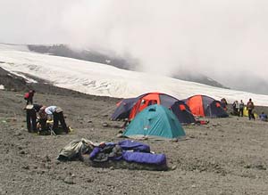 Проснулись в 5:30, легко перекусили, собрали барахло и вышли в БЛ. По высоте нас разделяет 850 м. Идем достаточнол бодро, солнце закрыто высокой облачностью, что на облегчает путь. Дошли до БЛ за 2 часа вместо планируемых четырех. Поставили еще несколько палаток, сварили обед с салатом из свежих овощей. После чего часть участников выявила желание двигаться ставить следующий лагерь и начать заброску газа и продуктовых модулей на 3900м. Погода портится, рваные клочья тумана, ветер то и дело меняет направление, то и дело моросит. Однако в 13:30 группа из 6 человек (2 взрослых и 4 детей), взяв рацию и гармин выходят на маршрут. Мы же наводим порядок и проходим акклиматизацию в БЛ. Через пару часов готовимся выйти на ледник для проведения занятий.