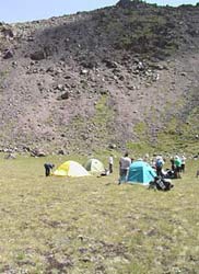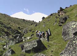 И вот мы у начальной точки нашего пути, Роман берет у нас интервью для ТВ, мы прощаемся с замечательными людьми в зеленых погонах и вертолет уходит на базу. Нас пригласили представители МЧС, которые записали нас в журнале регистрации альпгрупп, это приятно удивляет. Через некоторое время мы на месте нашего акклиматизационного лагеря на 2870м на дне бывшего озера, где по некоторорым данным находился немецкий аэродром. Вид Эльбруса с северной стороны поражает воображение, природа вокруг нетронута, в отличие от Баксанского ущелья. Готовим обед в окружении большого количества сусликов, которые удивлены нашим рационом и надеятся на вкусненькое. Дети прикармливают их орешками. После обеда дети разбрелись по близлежащим склонам, реализуя накопленный энергетический потенциал. Связались с БЛ, слышимость отличная, живем ! И еще одна приятная новость, как нам сообщили в БЛ протекает ручей и не придется топить снег. Всем привет, до связи.