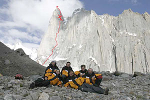 Вчера поздно команда успешно спустилась со стены вниз (см. фото). Обошлось почти без проишествий. Уронили один рюкзак (нашли внизу) и развалился один баул с платформой (не нашли :-( Все целы и здоровы и уже завтра мы уходим вниз в Канде. Практически все , что планировали мы сделали. Пройден очень серьезный маршрут на одну из красивейших и сложнейших стен Каракорума. Со стены был совершен бейс прыжок в костюме крыло (см. фото) в очень непростых условиях (стена нестрого вертикальна и имеет систему полок).
