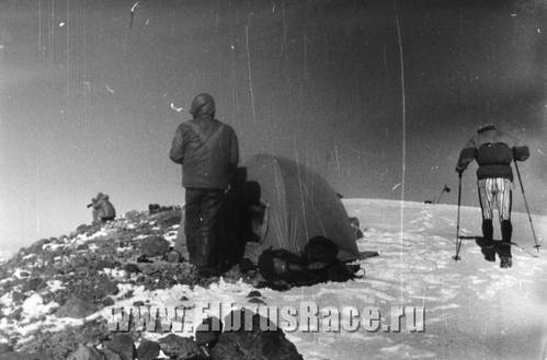 Забег 1990 года, на выходке на Восточную вершину Эльбруса. Слева В.Балыбердин с кинокамерой, справа - финиширующий А. Букреев.