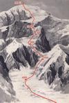 Путь по скалам логичен, встречается старое железо, есть немного разрухи. После пяти веревок скал начинается ледовый гребешок, выводящий на основной гребень (4 веревки).