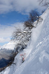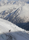 Отдюльферявшись первый и второй участок, мы оказались в начале довольно крутого кулуара с мягким снегом. К тому моменту я уже привык к подобным рельефам и спокойно, без особого напряга спустился вниз.