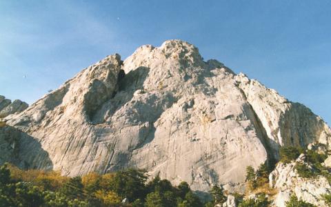 Как-то, случайно рассматривая гору с дороги, в левой верхней части я заприметил внутренний угол, слегка поросший травой. Не один из известных мне маршрутов не проходил по нему, а нижняя часть логично подставлялась к углу
