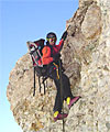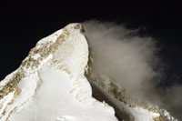 Преодолев скальную стенку, я услышал, как Дима зовет меня: «Санчо!». По несложным скалам я подошел к нему, мы глотнули чай и съели по половинке сникерса. Видимость – никакая, постянно дует ветер, по склону метет поземка. На наше счастье вверх по снежному куполу уходили перила из связанных между собой репшнуров и веревок, которые и определяли правильный путь подъема. Примерно через пять веревок перила закончились, и мы подошли к снежному ножу. Именно в этом месте в 2001 году сорвался Ваня...