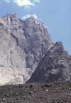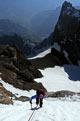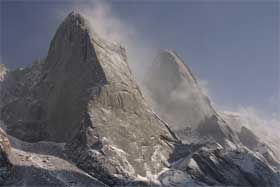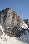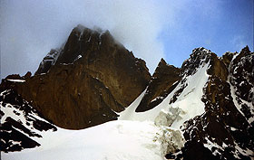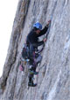 Шестой день на стене, утром очень холодно, чувствуется высота, в скалах много замезших ледяных ручейков. Сошников А. уходит вверх и проходит веревку до гребня.