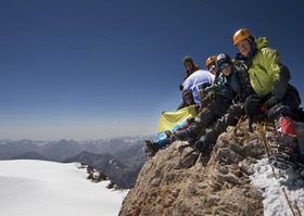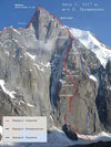 За карнизом не проще – нависающие углы, "гудящие" нашлепки, снежные заряды все время. Снег уже не тает. Ночуем под нависающим углом. Еды уже мало, но гребень где-то недалеко... Новый маршрут на пик 4600 по центру С стены: max 6а, А3, лёд 55 градусов, 850м