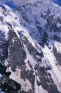 Очень много снега выпало весной, вся Северная стена молчала все лето, покрытая панцирем снега, маршрут можно было идти любой. При этом погода целый месяц стояла великолепная. Только 3-го Июля запомнились масштабные лавины с Крумкола ночью, почти весь пояс сбросов отвалился, лавина светилась огнями, видимо, статическое электричество или искры от камней, она походила на вулканическую лаву... ...Высота выше 4500, поэтому с рюкзаком уже не побежишь. Подъем на перемычку крутой. Вначале лед, потом снег 60 градусов, все ползет обратно, верхний висячий ледник кусочками валится, пролетая рядом...