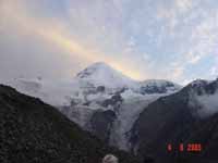 Очень много снега выпало весной, вся Северная стена молчала все лето, покрытая панцирем снега, маршрут можно было идти любой. При этом погода целый месяц стояла великолепная. Только 3-го Июля запомнились масштабные лавины с Крумкола ночью, почти весь пояс сбросов отвалился, лавина светилась огнями, видимо, статическое электричество или искры от камней, она походила на вулканическую лаву... ...Высота выше 4500, поэтому с рюкзаком уже не побежишь. Подъем на перемычку крутой. Вначале лед, потом снег 60 градусов, все ползет обратно, верхний висячий ледник кусочками валится, пролетая рядом...