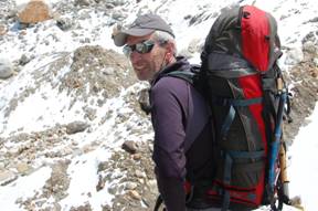 Глубокой ночью, связавшись веревкой, дергая друг друга, мы в снегоступах бежали под всеми этими ледопадами и «живыми» склонами. По старым смерзшимся лавинным выносам. И так же спешно начали набирать высоту к бергшрунду