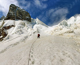 Под кулуары и первый пупырь слева - это считается вершина, - сказал Денис. - Там скальная стенка, старые перила, вылазишь на огромный снежный карниз метров 12 в высоту, с перемычки там метров 40.
