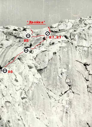 Далее по гребню пройти 120 м подойти к полочке перед верхним большим карнизом — R7.