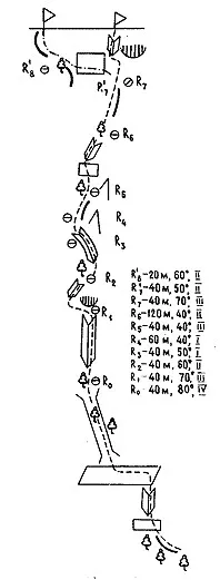Отсюда перейти через перегиб влево и по расчлененным скалам подняться вверх к сосне. От сосны влево по большому кулуару выйти на гребень (100 м).