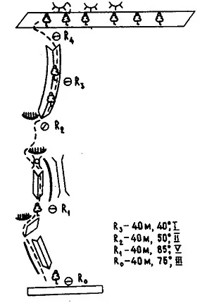 По небольшому контрфорсу в левой части полки подняться 15 м вверх, отсюда траверсом вправо перейти по плите на узкую полку, ведущую к дереву в основании большого внутреннего угла.