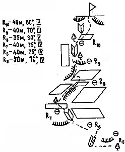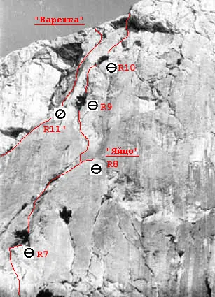 Прямо над пунктом R8 на плите набито несколько шлямбурных крючьев. На них не следует ориентироваться, а начинать движение нужно по щели в 5 метрах левее пункта R8. Щель, вверху загибается влево и превращается затем в вертикальный внутренний угол (V).